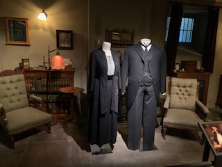 The exhibit began with fashions for the lady of the house. This first outfit has a blue Sunday hat, paired with a blue, embroidered, floor length dress. It was worn by Violet Crawly, who was the Matriarch of the house in the series.