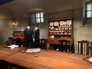 In contrast, another section of the exhibit was dedicated to the servant’s required uniforms. The Head Maid and Butler were in charge of everyone and dressed accordingly. The head maid of this household has a white button-down shirt paired with a floor length skirt. To finish off the look, there was a long black overcoat with a watch in the pocket in order to check the time and make sure the other servants were where they needed to be.