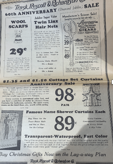 Trask’s Opened in 1877 on Ninth and State St. in downtown Erie. It was well known for clothing and everyday items for the house. In 1937, the local Erie newspaper featured Trask’s ads referring to its 60th anniversary as a Diamond Jubilee with year-long sales events. For local Erie families, Trask’s was a familiar and popular showroom.