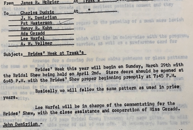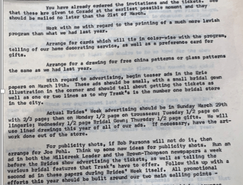 Each year, after the busy Christmas season, the staff and management at Trask’s, began a full-force effort to prepare for their signature “Spring Bride’s Week.” Planning involved nearly every department. Meeting notes acquired from the Hagan History Center’s expansive archives shows a number of duties assigned to each department before the annual event.